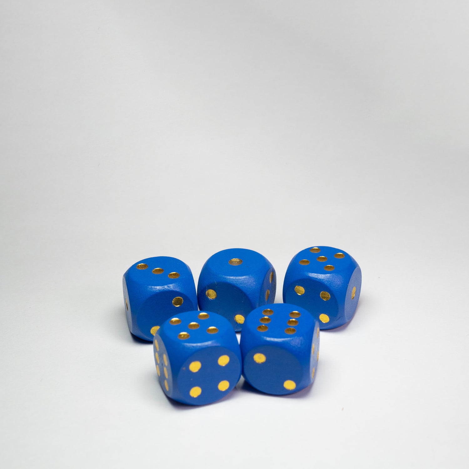 The classic wooden six sided 16mm die with indented pips, the D6 is a staple in most games from traditional family board games, to brand new print and play games. These packs of five blue with gold pips are great for almost any games you're designing.